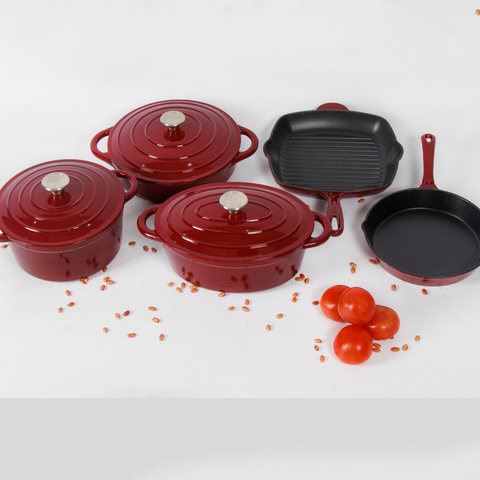 ชุดเครื่องครัว8ชิ้นทำจากเหล็กหล่อเคลือบสีแดงอุปกรณ์ในครัวเรือนหม้อหม้อทำอาหารแบบไม่ติดกระทะ